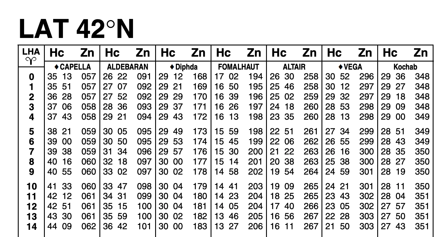 To use the Site Reduction Table, select page that contains the latitude of your AP, find LHA Aries, and then move right to the celestial body you have shot. The table gives you the Computed Altitude Hc and the True Azimuth Zn, more on that in a bit.