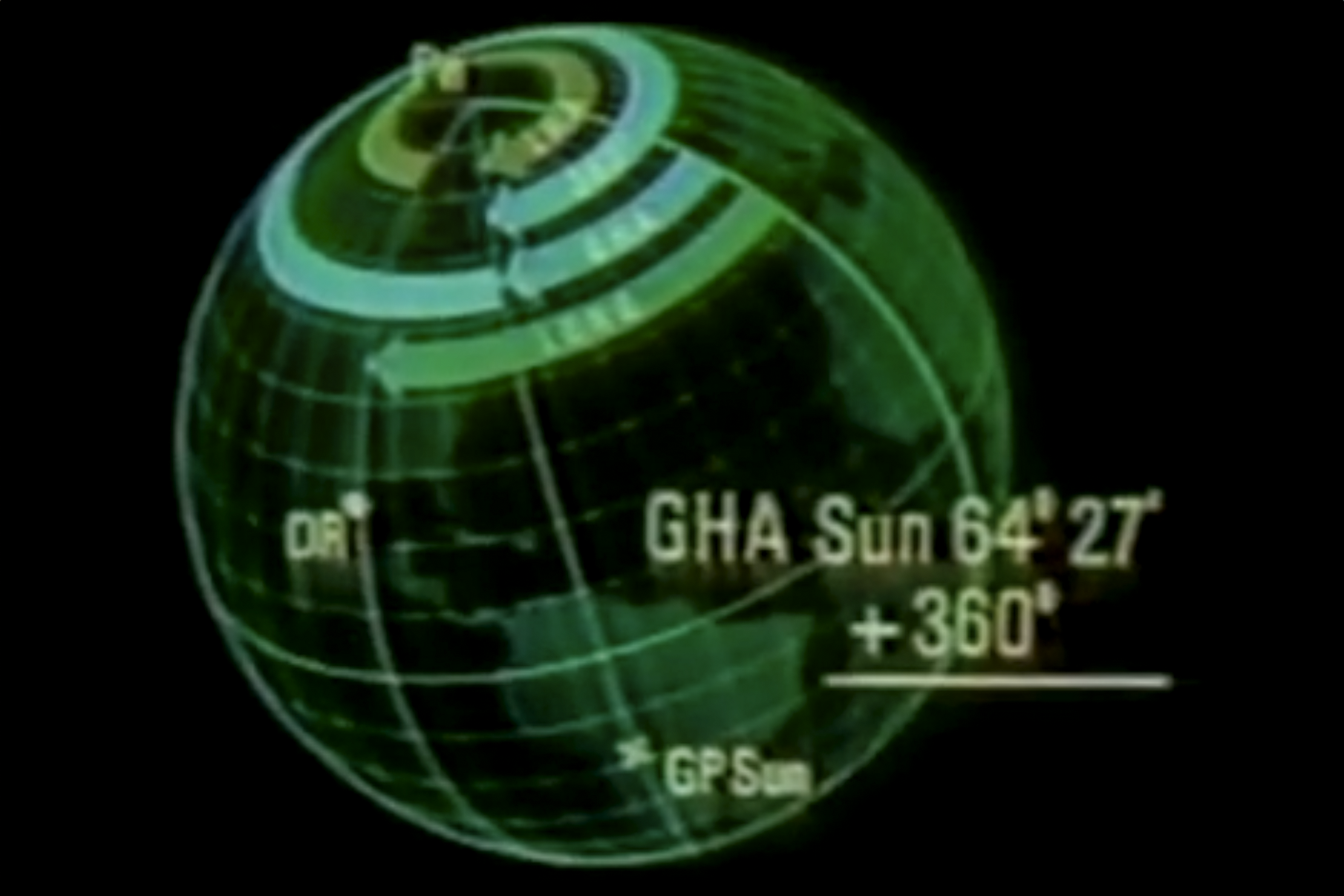 Next you determine the celestial body’s position using the GHA and declination from the Air Almanac, as before. Recall that the Greenwich Hour Angle GHA shows the angle between the Prime Celestial Meridian and the hour angle of the celestial body, effectively its longitude. The declination is the celestial body’s altitude (latitude).